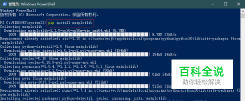首先,在进入正题之前,我们先做一些准备工作,如果你已配置好本机的Python环境。使用管理员权限打开命令提示符(win10 Widows+ x在弹出的菜单项中选择 cmd 管理员)。在打开的命令提示符窗口中输入: pip install maplotlib 按Enter确定后,会自动开始下载,如下所示: