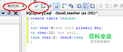输入一下代码,建立表,内容根据表的内容自行设计,点击对号,查看语法是否正确,点击执行