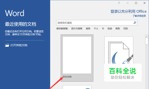 1、鼠标左键双击计算机桌面Word2016程序图标,将其打开运行。在打开的Word2016程序窗口,点击“空白文档”选项,新建一个空白Word文档。如图所示;