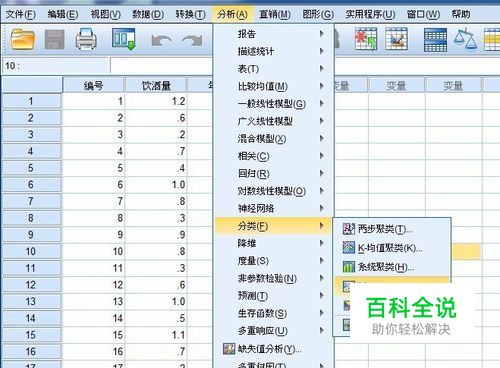 首先,我们先用整理好的训练数据来生成一个决策树。 用SPSS打开整理好的训练数据。该数据是研究婴儿早产和孕妇饮酒量和年龄的关系。 打开数据后选择分析---分类---树
