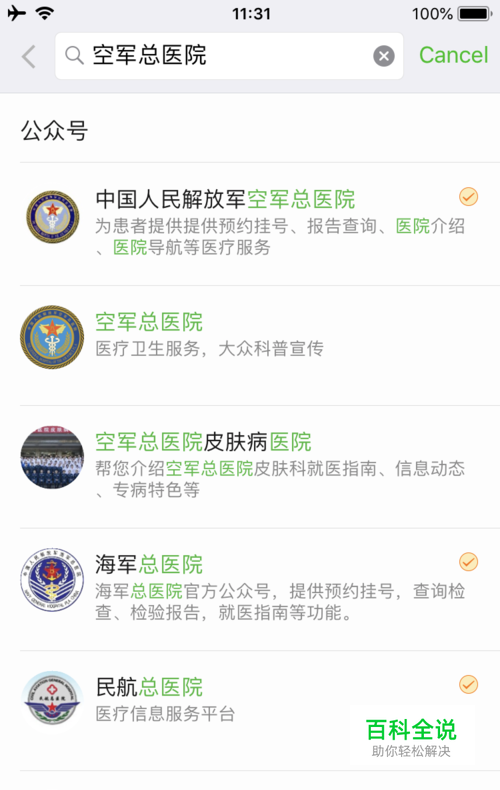 在公众号搜索里面,搜索空军总医院,就能找到官方认证的空军总医院的公众号,我们关注一下。