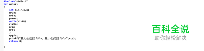 #include"stdio.h" int main() { int m,n,r,p,q; m=24; n=54; p=m*n; while(m!=0){ r=n%m; n=m; m=r; } q=p/n; printf("最大公倍数 %d ,最小公约数 %d ",n,q); return 0; } 最后运行后如图所示