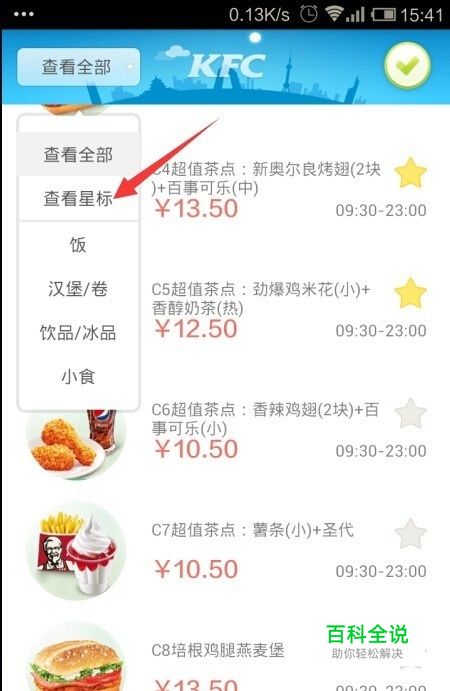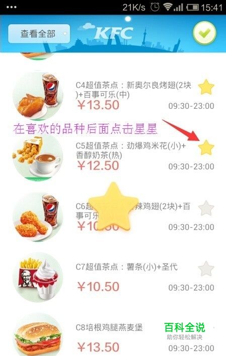我们去肯德基点餐时就打开该软件——查看星标——会显示刚才我标记过的食物,方便我们查找。