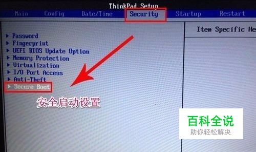 进入BIOS主界面之后,默认显示的是Main这一项,先把光标移动到Security(安全)这一项来,然后用上下方向键,把光标移到“Security Boot”,其中文意思是“安全启动设置”,如果要用传统方法启动U盘或光盘,必须对此项进行设置,按Enter键进入。