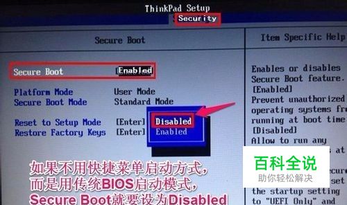 进入到子页面后,选择其中的Secure Boot这一项,按Enter打开小窗口,选择Disabled(关闭)这一项,再按Enter确定