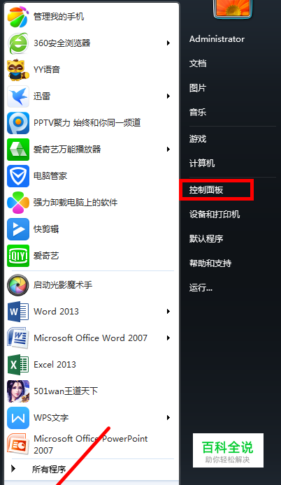首先点击下图箭头所指位置的图标,打开“开始”菜单,并在右侧点击“控制面板”。