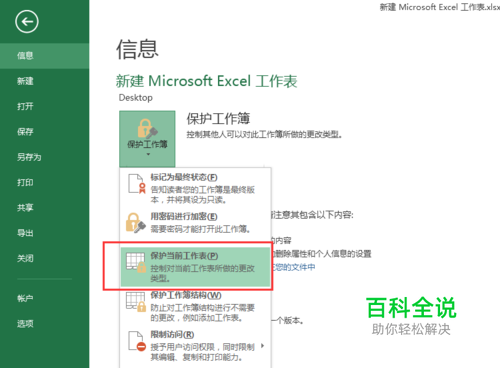 如何操作呢? 点击左上角“文件”-“信息”(位于第一行)-“保护工作簿”-“保护当前工作表”