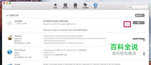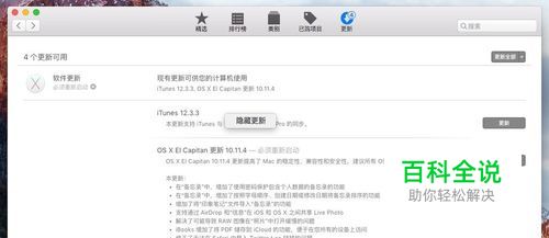 隐藏与显示“更新”项目 在“更新”中,仅能隐藏系统及内置应用如 iTunes 等项目,而第三方应用以及下载的苹果开发的应用如 Xcode 等并不能隐藏。另外,如果当前系统更新包含多个项目,比如此次有 iTunes 及系统更新,需要逐条隐藏,并不能统一隐藏所有项目。点击右边的“更多”。 然后就会显示更新的所有项目及其更新信息,右键点击项目即会出现“隐藏更新”,点击即可。 将此次更新中的 iTunes 及系统更新均隐藏后,可以看到之前的4条记录只剩下3条了。 要显示“更新”中的项目,非常简单,点击菜单栏-商店-显示所有软件更新,等待一会儿,即可恢复了。当然,这个“一会儿”要由你的设备及网络情况决定。