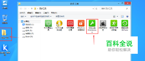 进入到win8pe防蓝屏版系统桌面后,双击桌面上的“更多工具” 文件夹,在文件夹中找到并双击“分区工具DiskGenius”图标,打开工具,如下图所示: