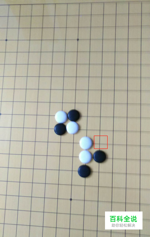 如果无法牵引对手,就需要及时堵对手棋,有时候防守也是一种进攻。堵对手棋一子堵多子为佳。下面黑棋下在方框位置,不仅阻碍白棋成三连,而且分隔出一个单一的子。