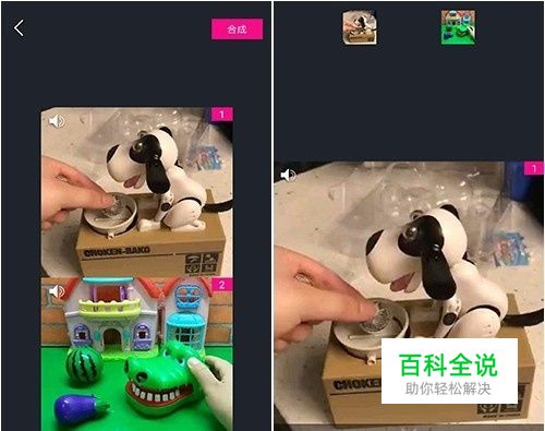 制作页面,视频默认是上下拼接的,两个视频会同时播放,点击模板按钮,选择依次播放,视频会根据你导入的顺序播放。 点击音量按钮,可以分别调整每段视频的音量,避免忽高忽低,接着点击右上角合成就只做好了,可以看出包括剪辑在内,都是一健式的操作,很容易上手。