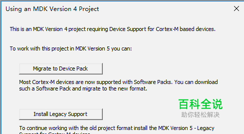 此次我们以stm32f103ve芯片为例子 打开创建好的项目文件,发现找不到这个芯片 默认会有以下提示 选择第一项 migrate to device pack