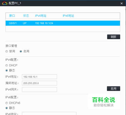 再次鼠标右键点PC1图标,左键选【配置】见图2 接口管理点【启动】 IPV4配置选【静态】,IP地址设置:192.168.10.1 掩码地址设置:255.255.255.0 点【启用】 IPV6配置不用设置 点【刷新】看到该pc状态为UP即可 同样,PC2 的IPV4配置选【静态】,IP地址设置:192.168.10.2 掩码地址设置:255.255.255.0 点【启用】 点【刷新】看到该pc状态为UP即可