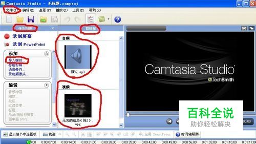 我们首先确定需要在线分享的音频的时长,然后找一段时长大于或等于该音频的视频备用,视频的画面最好跟音频内容比较协调。打开视频编辑软件Camtasia Studio,依次进入“文件”菜单-“导入媒体”子菜单,或是在任务列表上的“导入媒体”菜单,把音频文件和视频文件导入到软件的剪辑箱