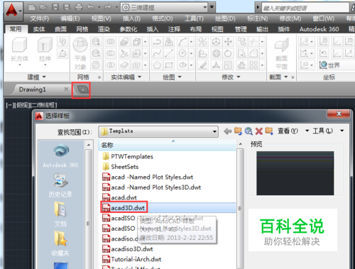 AutoCAD2014软件打开后,点击绘图区标签页旁的【+】打开【选择样板】对话框,从中选择打开样板文件acad3D.dwt。