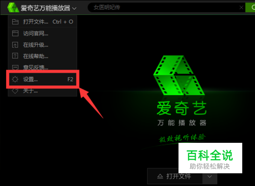 我们需要先打开设置看看截图保存的位置以便于以后找到这些截图,还需要看看截图的组合快捷键是什么,帮助我们正确使用。 打开设置界面的方式主要有三种,一是直接点击播放器左上角的图标位置就可以找到【设置】;而是右击播放器屏幕选择【设置】;三是直接使用软件默认的快捷键 “F2”。