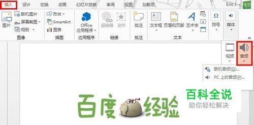开启Powerpoint 一句下面路径找到插入音乐的选项。“插入——媒体——音频——PC上的音频”