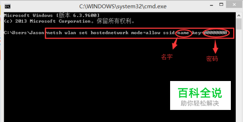 输入netsh wlan set hostednetwork mode=allow ssid=name(无线名字) key=00000000(8位以上密码)