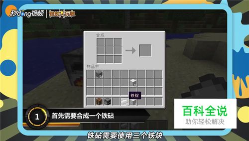 然后需要使用三个铁块和四个铁锭合成,铁锭可以通过炼制铁矿石获得, 铁块可以用九个铁锭来合成。