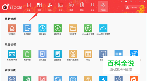 然后在电脑上的打开iTools软件,在上方栏目选择“应用”进入到里面。