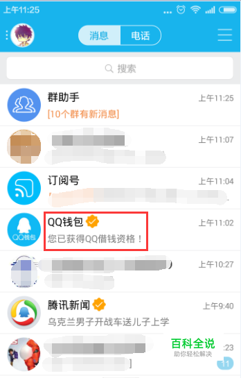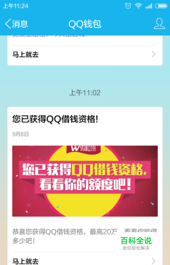 首先在手机上打开手机QQ软件,可以看到QQ钱包推送的消息,已获得QQ借款资格,如下图所示。