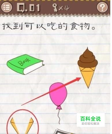找到可以吃的食物,首先看下图里面的几个图,都是不可以吃的东西,然后我们可以想,有没有2个图像组合起来可以吃的。就是把左下角的钻石样的东西拖到便便的下面,就变成了一个冰淇淋。是不是感觉都有点不太想吃冰淇淋了。