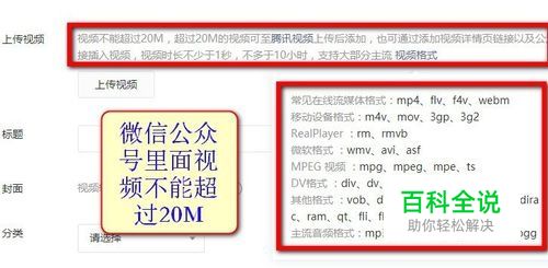 微信公众号:视频不能超过20M,超过20M的视频可至腾讯视频上传后添加,也可通过添加视频详情页链接以及公众号文章链接插入视频,视频时长不少于1秒,不多于10小时,支持大部分主流,如下图所示。