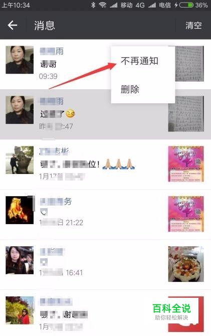 这时会弹出一个菜单,可以选择“不再通知”菜单项。