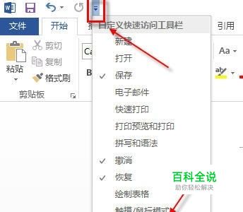 Word中的“发送到Microsoft PowerPoint”功能不是常用命令,选择进行调出。点击Word顶部快速访问工具栏最后的按钮,按图示步骤添加到面板上。