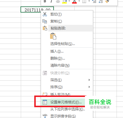 选中该单元格,右键单击弹出下拉菜单选择“设置单元格格式”
