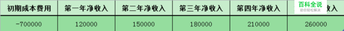第三步,输入或引用近四年来的支出和收入数据,说明:这里计算的是投资四年后的内部收益率。输入“=IRR(表3[[初期成本费用]:[第四年净收入]])”;