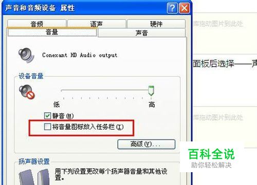 在打开的声音和音频设备中选择“音量”,勾选“将音量图标放入任务栏“点击确定!