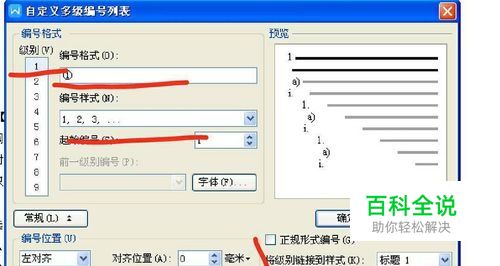 在弹出的对话框中对一级标题进行设置,在级别栏中选择1,编号样式处选择需要的编号格式,点击“高级”,对编号以及字体位置进行设置,接下来在右下角处选择“标题一”,此时标题一编号格式设置完毕