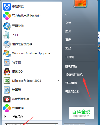 点击左下方的“开始”,找到“设备和打印机”,单击打开