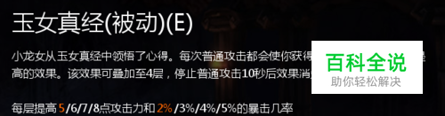 E技能:玉女心经 小龙女从玉女真经中领悟了心得。每次普通攻击都会使你获得致命一击率和攻击力提高的效果。该效果可叠加至4层,停止普通攻击10秒后效果消失。