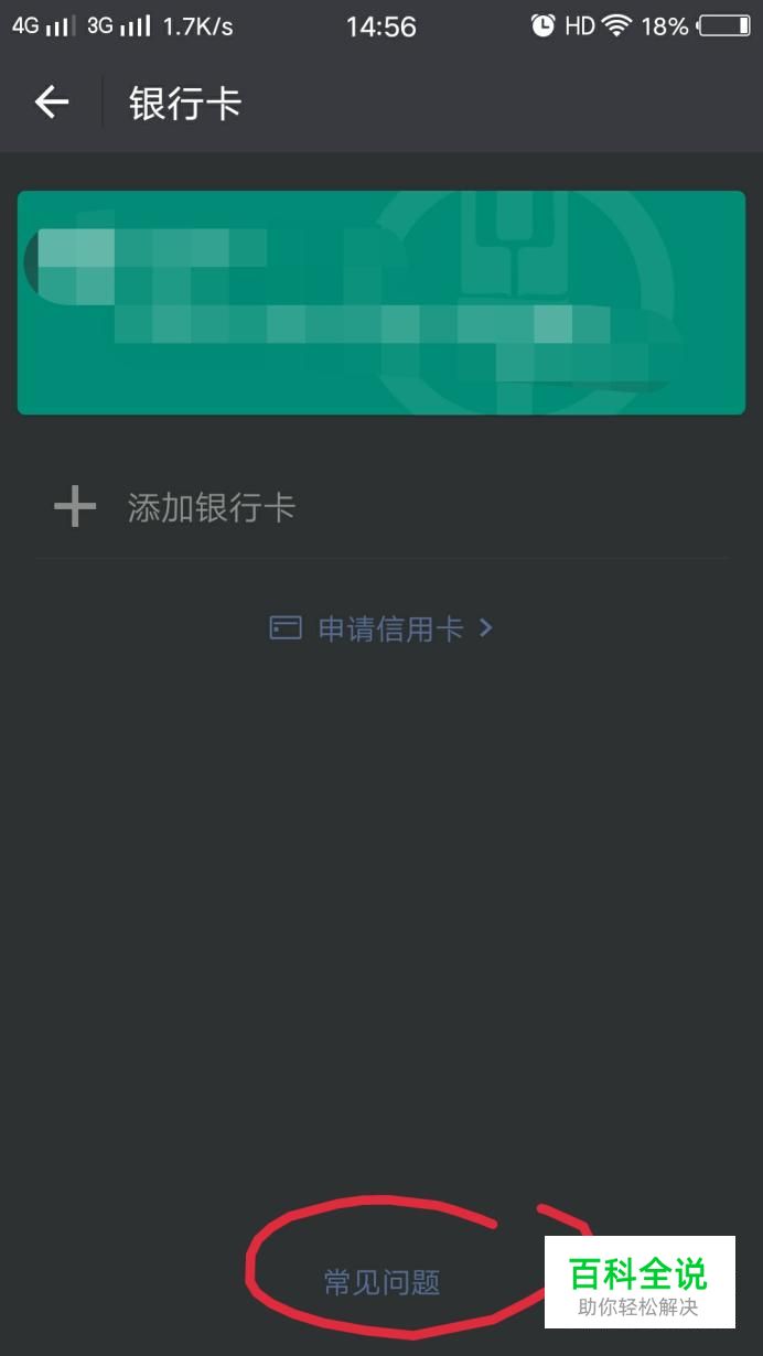 进入后,可以看到绑卡信息,在最下方,有“常见问题”四个字,点常见问题。