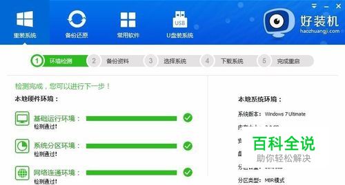 系统重装软件自动检测硬件环境,确保系统安装成功,点击“检测完成,下一步”;