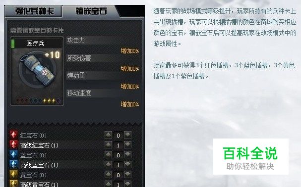在玩家进入房间选兵种卡片时,注意旁边就是强化区和镶嵌宝石地方,其中红宝石加攻击力,蓝宝石加防御力,黄宝石加子弹数,紫宝石加速度!玩家最多可获得3个红色插槽,3个蓝色插槽,3个黄色插槽及1个紫色插槽。