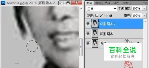 为了保留修复过程,可以将“背景 副本”复制生成一个“背景 副本2”图层,我们接下来的操作将在这个图层上进行,仿制图章的使用也比较简单,先按住Alt键,移动鼠标指针到想要充当仿制源的地方单击,然后放开Alt键,将鼠标指针移动到想要仿制的位置,按住左键来回的擦拭即可,不过细节操作上要把握好,要多练习才能达到较灵活的应用,如下图所示: