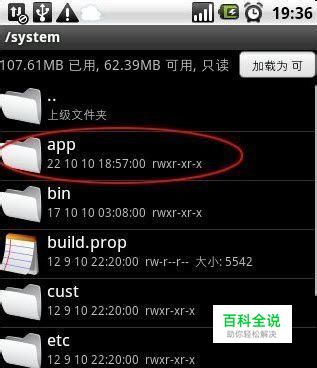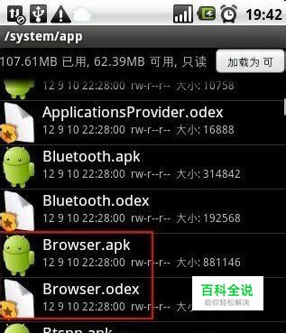 4、在app文件夹内,可以看到许多图标是机器人的文件,在界面的右上角会有一个“只读”的标记。点击旁边的“加载为可…”按钮,此时“只读”标记就会变成“可写”。此时我们就可以对这些列表里的程序进行管理了。下面举个例子作为示范:删除系统自带的浏览器,在列表中找到“Browser.apk”和“Browser.odex”两个文件。