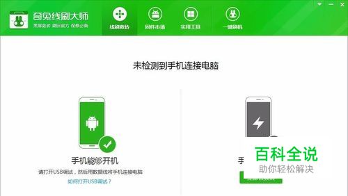 连接手机,能开机的打开USB调试即可连接。如果不能开机,进入自己机型的线刷模式再连接电脑。(若电脑提示连接异常或不停闪跳,请检查驱动和数据线或端口问题)。