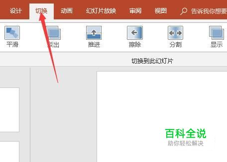 接着点击导航栏上的切换,直接在这里可以设置不同幻灯片之间的切换方式,直接点击即可。