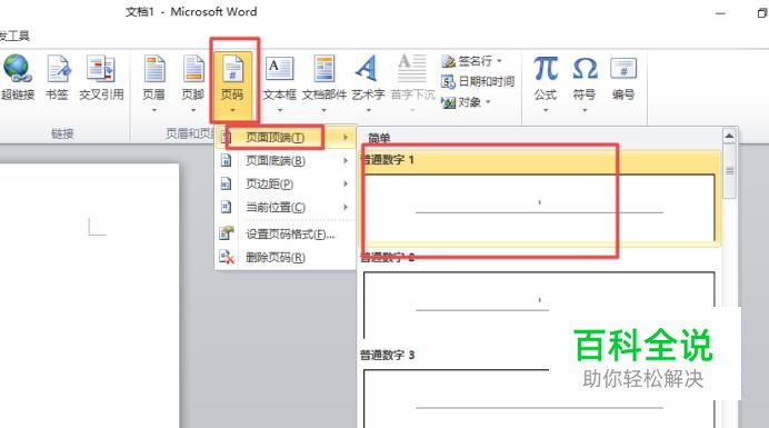 之后我们点击页码,弹出的界面,我们点击页面顶端,之后我们点击第一个;