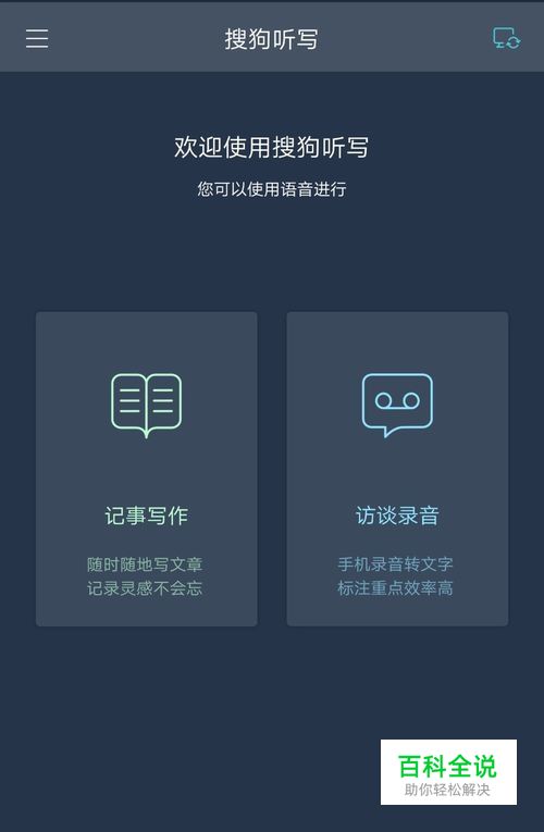 打开软件。进入主界面后可以看到,搜狗听写提供了“访谈录音”或“记事写作”两种记录方式,你可以根据自己的需求,做出合适的选择。(两种记录方式的操作基本类似,此处选择访谈录音为例)