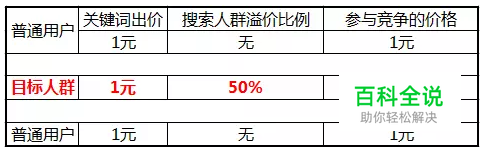 当用户发起搜索匹配到推广结果时,假如用户命中了广告主设置的某个人群,获取该人群的溢价比例(假设X%),并用关键词出价*(1+X%)去参与竞争。 当同一用户被圈定到不同的人群包时,去重采用溢价比例最高的。
