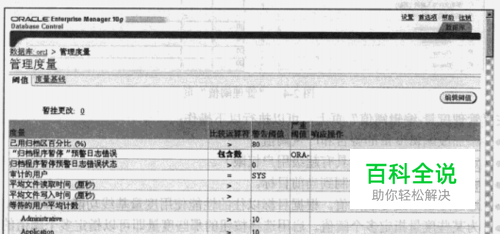 “管理度量-编辑阈值”页上,可以执行以下操作: 添加或编辑度量的警告和严重阈值。 定义响应操作(如果具有超级用户权限)。 将阈值从另一目标复制到当前目标。 通过度量基线复制阈值。根据目标以往的性能使用度量基线功能计算阈值。 为某些度量指定多个阈值。启用选择按钮的那些度量即可以指定多个阈值的度置。其中某些度量具有Oracle定义的默认阈值。在评估度量时,度量的值将通过比较运算与阈值作比较。比较运算符是无法更改的。 在编辑阈值时,选择在典型工作量下可接受的值。如果已知目标的工作量不高,应避免选择较低的阈值,以免生成大量预警。表2-1提供了所列字段的说明。 表2-1列字段说明 字段 说明 繁告和严重阈值 能够反映Oracle按基线定义的默认建议值或可以更改的默认建议值 响应操作 指操作系统命令或脚本,当度貴达到其聱告阈值或严重阈值时,Oracle Management Agent便会执行该命令或脚本。“响应操作”必须包括全限定的 路径(例如,/private/jsmith),而且必须能够通过管理代理进行访问。只有具 备超级用户权限的管理员才能在“响应操作”字段中键入文本。否则,该字 段为只读 当需要编辑阈值的时候,需要创建度量基线,Oracle提供了 “管理度量-创建度量基线 页,用于创建度量的基线,如图2-5所示。