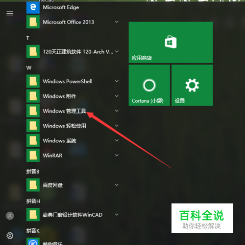点击左下角开始图标,如图弹出电脑程序的菜单,在菜单里面点击Windows管理工具,弹出下拉菜单,找到系统配置并点击。