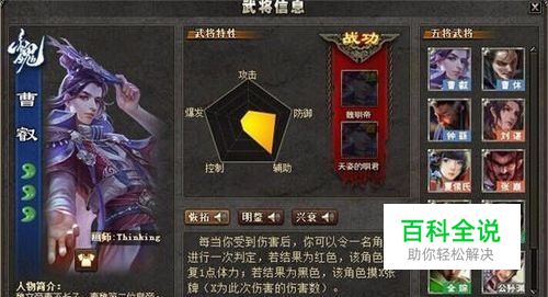 配合克制: 和曹睿配合最好是菜刀,因为可以额外出杀,需要牌的角色也可以很好的配合。当然还有一些别的:司马懿配合可以增大恢拓回血概率,主公曹丕则可以弘威。 克制曹睿的最好是张春华,界马超。再来就是限制他明鉴的满宠,大乔,李儒。限制恢拓的高输出界许褚,黄忠。改判的司马,张角等。