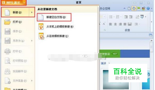首先,打开wps演示,点击左上角上的“wps演示”按钮,在下拉菜单中选择“新建”——“新建空白文档”选项。