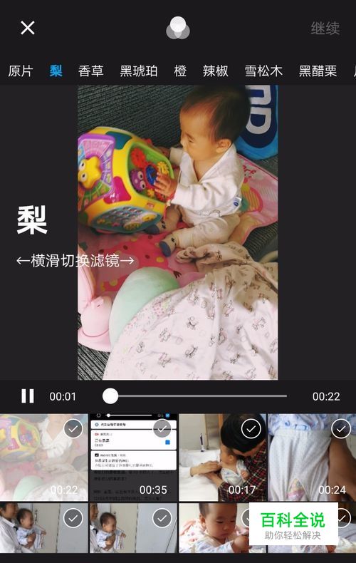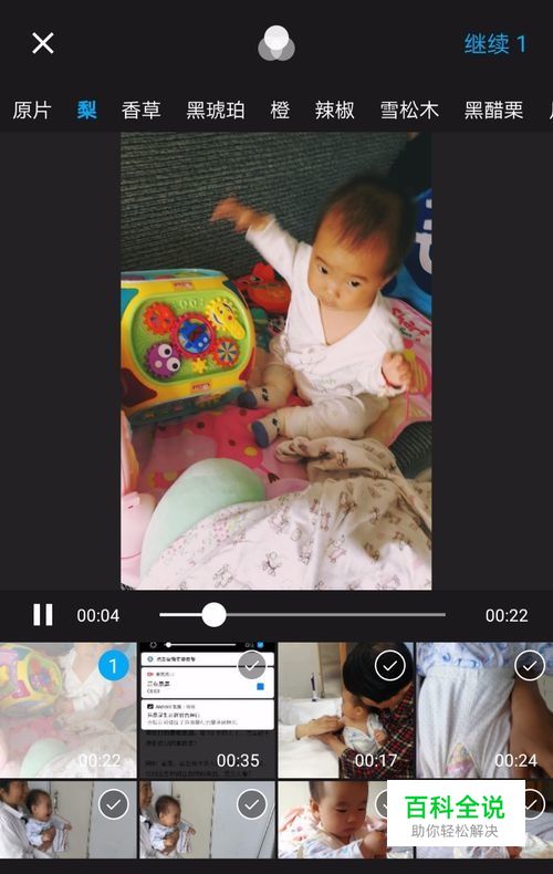 进入排序界面,不用理睬,继续点击:继续 按钮,进行下一步;然后进入添加音乐和添加录音界面,选择视频,进入编辑页面